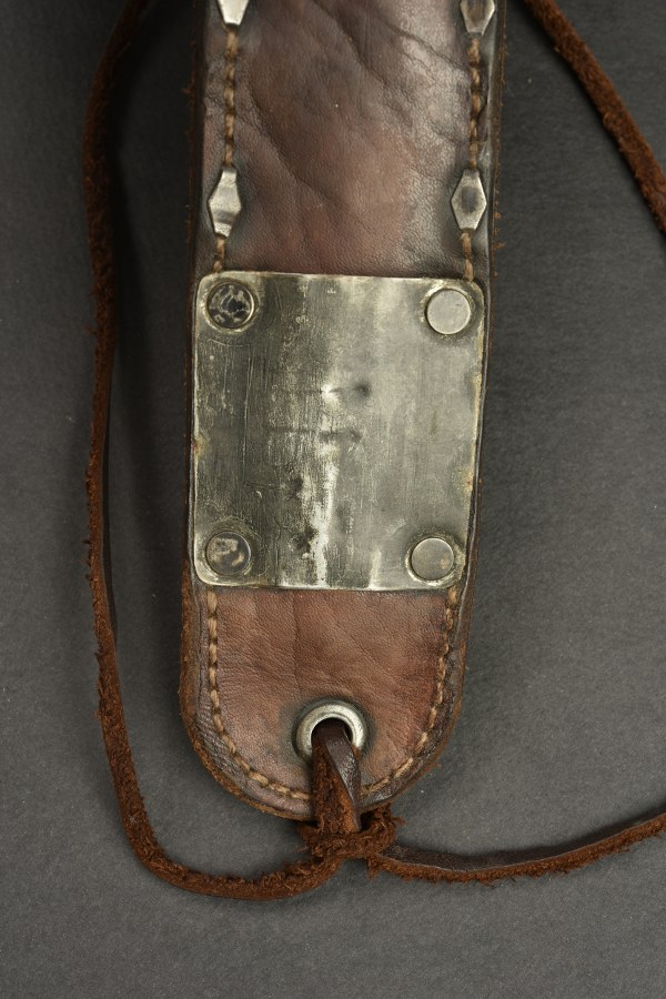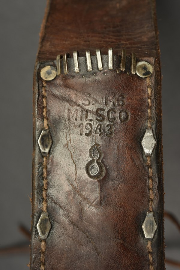 Couteau USM3, fourreau USM6. Pommeau disposant d'un seul rivet de maintien, il s'agit donc d'une reproduction. Belle grenade de l'Ordnance Corps US visible. Poignée composée d'anneaux en cuir. Belle lame dans sa couleur d'origine à 90%. Fabrication US M3 Camillus. Fourreau USM6 en cuir, huit agrafes d'entrée au fourreau. Fabrication US M6 Milsco 1943. Le crochet de fixation au ceinturon est présent. Lacet en cuir présente, mais dénoué. L'authenticité du fourreau n'est pas garantie. A noter une certaine usure et patine de la pièce. Etat II+. 2+
