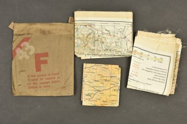 Cartes d'évasion en soie. Comprenant un pochette en toile imperméabilisée, ouverte, marquages F en rouge, ainsi MARK III, et 43 à la peinture blanche. Déchirures sur les côtés de la pochette. Contenant une carte en soie, marquée 3C, pliée d'origine, au recto Sheet C Holland Belgium France Germany et au verso Sheet D Belgium Germany. Une seconde carte en soie, pliée d'origine, au recto marquages Sheet A, France Belgium Holland, au verso Sheet B, France Spain. Une troisième carte en soie, marquée 43 K Portugal Spain au recto. Au verso Spain France. Pliée d'origine. Selon les informations du vendeur, ces cartes ont été retrouvées par Jacques Collé, propriétaire du musée de Dieppe, dans l'épave d'un bombardier qui s'est écrasé à Dieppe. A noter une certaine usure et patine des pièces. Etat II+. 2+