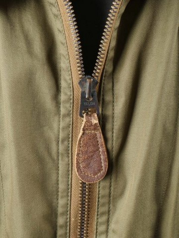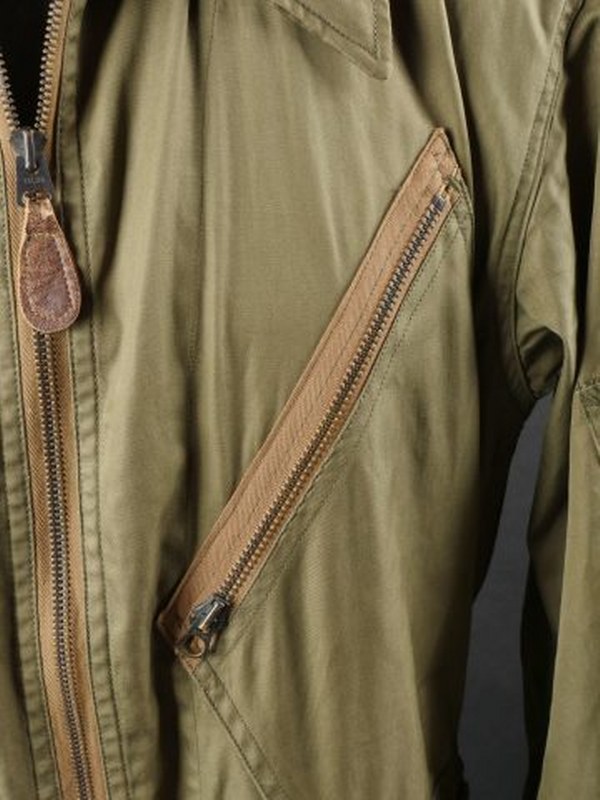 Combinaison de vol K1. En popeline kaki. Les fermetures éclaires sont fonctionnelles. Col partiellement effiloché. Bel insigne USAAF dans le col. Etiquette marquée K-1. Fabrication Davis Sportswear Inc, datée 1945. Taille Medium Regular. A noter une certaine usure et patine de la pièce, ainsi que quelques tâches et accrocs. Etat II+. 2+