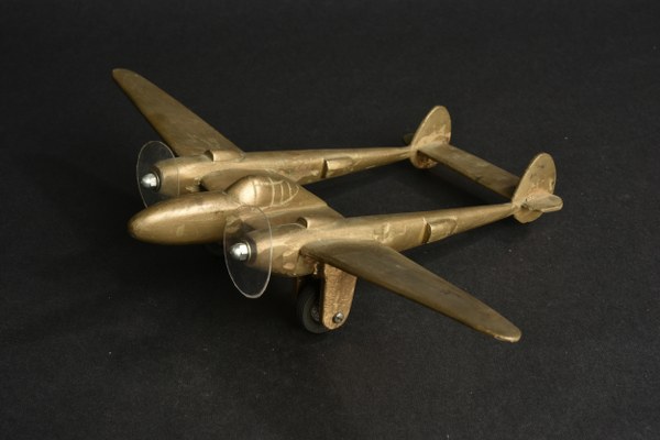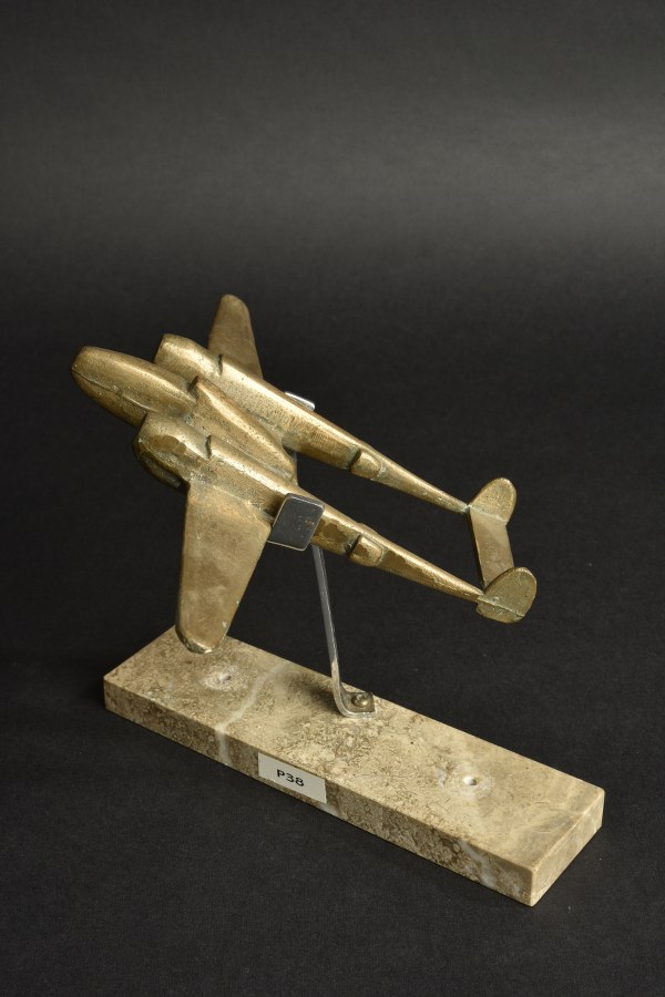 Lot de 2 modèles d'avions américains P38 Lightning en bronze. Un d'une longueur de 23,6 cm x envergure 33,3 cm sur roues avec hélices constituées de disques de plastique. Un second d'une longueur de 19 cm x envergure 27 cm, sur pied et terrasse en pierre. Très décoratif II