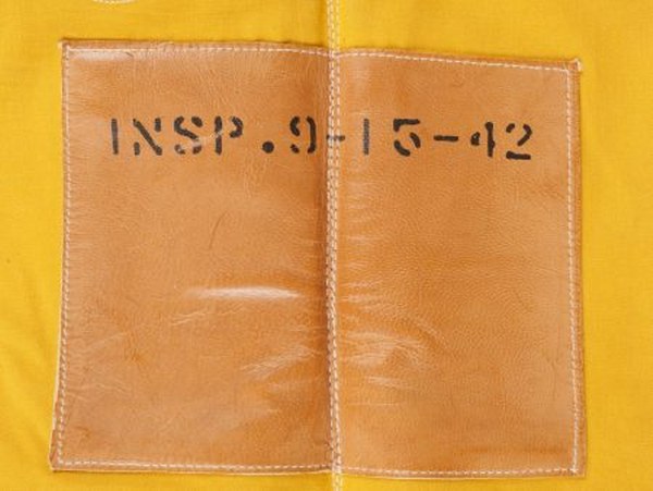 Mae Vest B-3. En toile jaune avec renfort en cuir marron. Toutes les sangles sont présentes. Toile souple. Les bombonnes de gonflage automatique sont présentes avec leurs cordelette. Les tuyaux de gonflage en caoutchouc sont présents. Fabrication Air Cruisers Co, datée du mois de septembre 1942. Inspection le 15 septembre 1942. A noter une légère usure et patine de la pièce, ainsi que quelques tâches. Etat I-. 1-