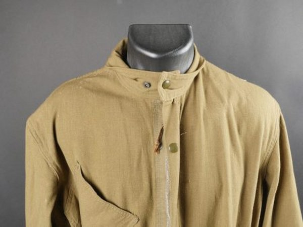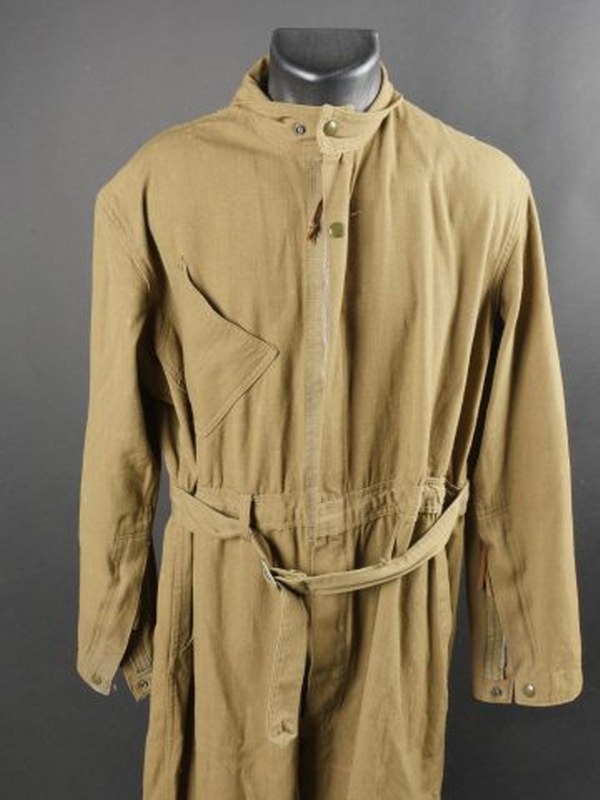 Combinaison de vol A-4. En épaisse toile kaki. Fermeture éclaire fonctionnelle, fabrication Crown, patte en cuir présente. Ceinture complète. Etiquette dans le col datée 1942, taille 44. A noter une certaine usure et patine de la pièce, ainsi que quelques tâches et accrocs. Etat II+. 2+