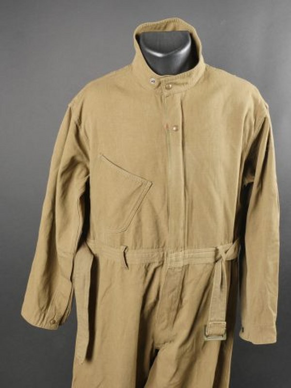 Combinaison de vol A-4. En épaisse toile kaki. Fermeture éclaire fonctionnelle, fabrication Crown, patte en cuir présente. Ceinture complète. Beau tampon à l'intérieur de la combinaison, Army Air Forces et sur l'épaule gauche. Etiquette dans le col datée 1942. Taille 44. A noter une certaine usure et patine de la pièce, ainsi que quelques tâches et accrocs. Etat II+. 2+