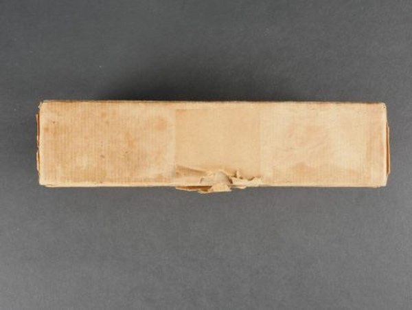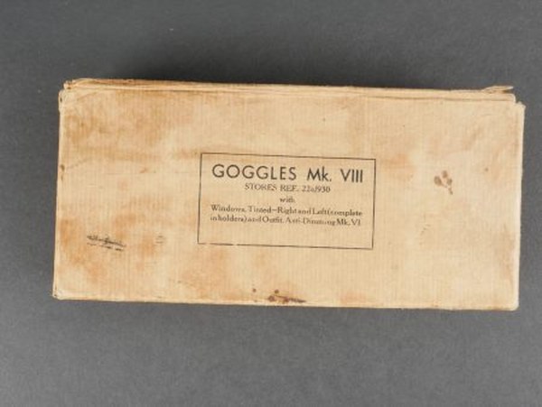 Boite pour accessoires de lunette MK VIII. En carton, présentant des marques d'usures et des manques. Couvercle marqué Goggles MK VIII Stores REF 22c/930. Contenant deux verres blanc et une boite en bakélite rouge. A noter une certaine usure et patine de la pièce. Etat II+. 2+