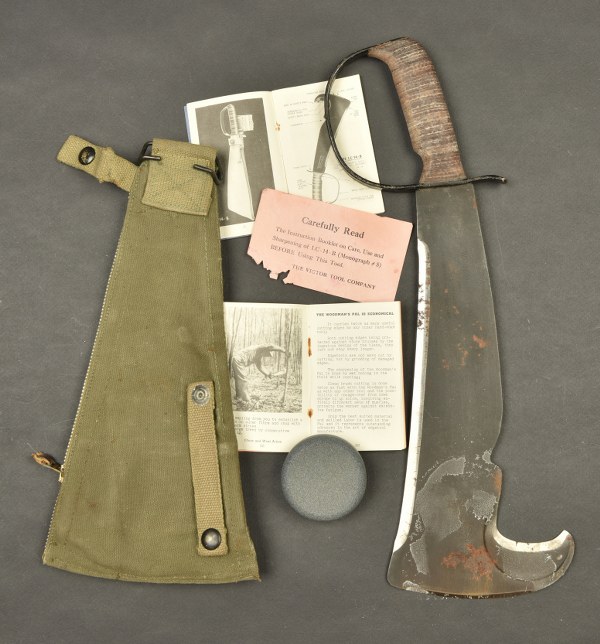 Machette LC-14-B. Manche en cuir, garde en métal. Lame complète dans sa couleur d’origine à 70%, fabrication Woodman’s Pal Victor Tool Co Reading. Pierre à aiguiser présente. Un livret Fighting knife LC 14 B, daté 1942. Un livret Care use and sharpening LC 14 B, daté 1942. Housse en toile OD, complète, fermeture éclaire fonctionnelle, fabrication Talon, bouton pression complet. Le crochet de fixation au ceinturon en métal est complet. A noter une certaine usure et patine de la pièce. Etat II+. 2+