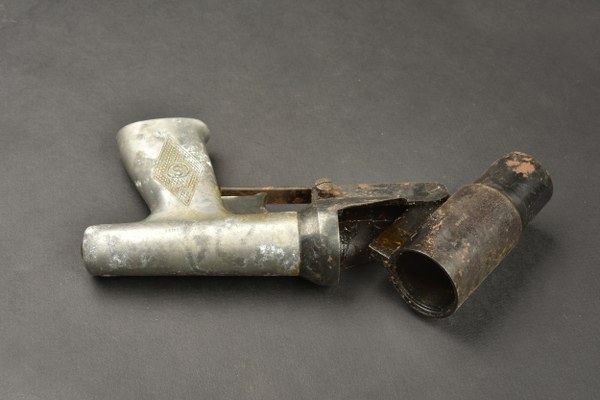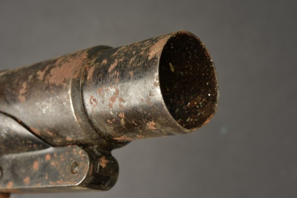 Pistolet lance fusée US Navy Coston Sedgley 37 mm modèle court. Pistolet lance fusée de la marine américaine de la 2nde guerre, poignée monobloc en aluminium avec losanges quadrillés et lettre S. Mécanisme et canon en fer bronzé. Calibre 37mm. Poussoir de basculement du canon et percussion fonctionnels. Existe en version canon long et canon court, ici le court. Peu courant. Légère oxydation, usure. II