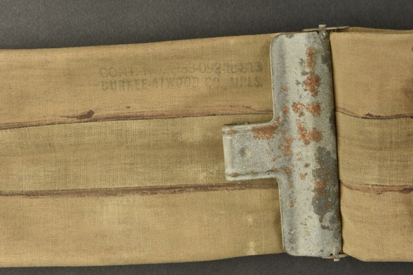 Bouée de sauvetage US Navy. En forte toile caoutchouté. Le crochet de fermeture est complet. Les tuyaux de gonflage à la bouche sont présents. Beau marquage USN au niveau du fermoir. Trois boutons pressions. Fabrication Durkee atwood Co MPLS. Date illisible. A noter une certaine usure et patine de la pièce, ainsi que quelques tâches. Etat II+. 2+