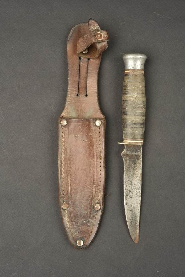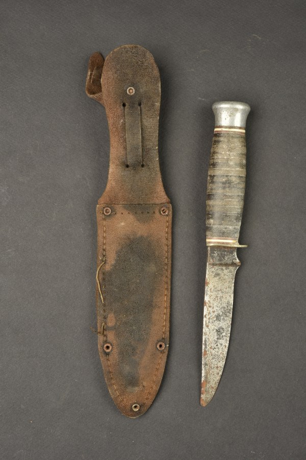 Couteau USN. Garnitures en métal. Manche composée d'anneaux en cuir. Lame fortement affûtée et oxydée. Marquages illisibles. Fourreau en cuir marron, bouton pression fonctionnel. A noter une certaine usure et patine de la pièce. Etat II+. 2+