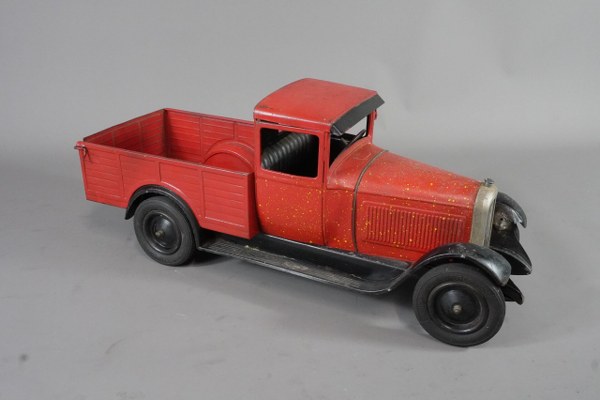 Automobile mécanique André Citroën marqué sous le camion, camion mécanique C4 à ridelles. Clé non présente. Points de rouille mais bon état général. 17,5cm x 42cm.