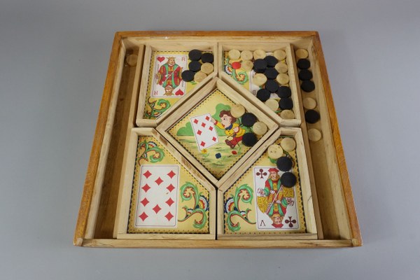 Un coffret de en bois comprenant plusieurs jeu de société. Le plateau coulissant présente un damier.