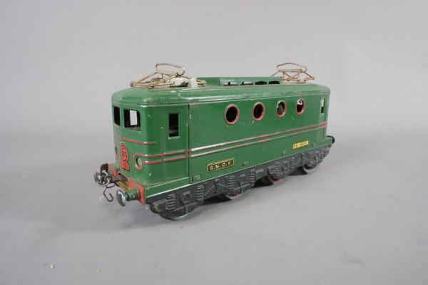 HORNBY. Lot de cinq locomotives et wagons en tôle. Petites oxydations, traces de rouille.