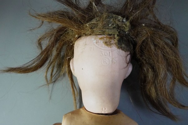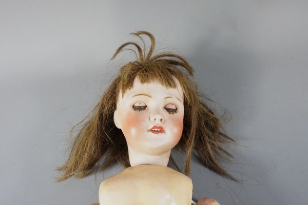 UNIS FRANCE - Taille 8. Poupée à tête de porcelaine et corps en carton bouilli. bouche et yeux ouverts. Mécanisme couineur. Petits accidents