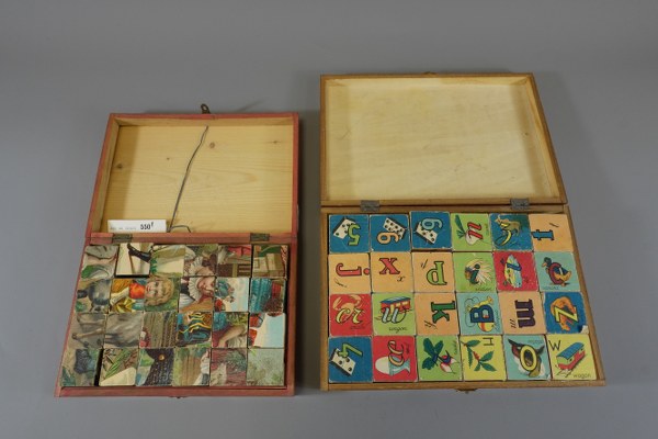 2 Boites de jeux de cubes XIXème. L' alphabet et militaires aux repos.