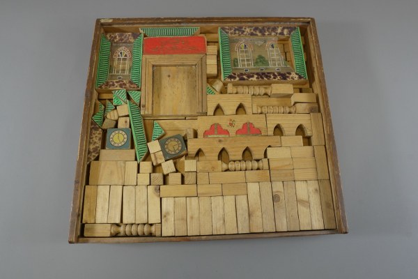 Jeu de construction en bois dans sa boite. Complicirte Schweizer Baukunst.