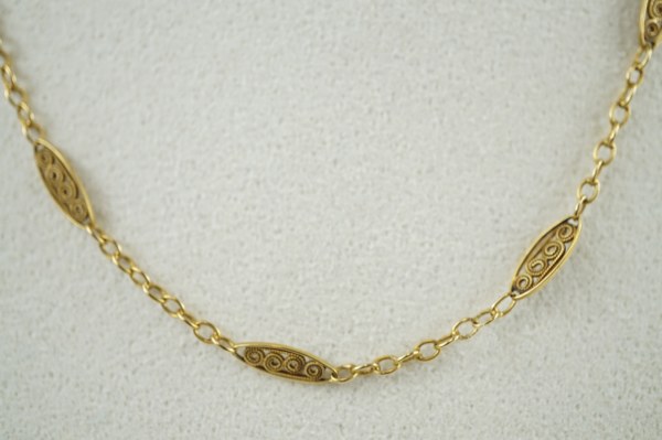Chaîne en or jaune (750°°°) à mailles articulées. Poids : 4.3 gr. Longueur : 45, 5 cm. On y joint un bracelet en métal doré à mailles articulées serties de petites pierres rouges.