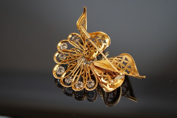 Broche en or jaune (750°°°) et platine simulant un nœud ouvragé serti de brillants et d'un diamant central demi-taille d'environ 1 carat. Poids brut: 24,2 gr.