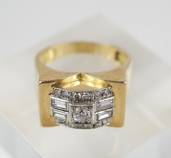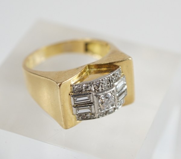 Chevalière Art Déco en platine et or jaune (750°°°). Sertie d'un diamant central taille moderne dans un entourage de brillants et de quatre diamants baguettes. TDD : 60. Poids brut : 9,8gr.