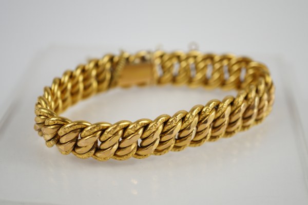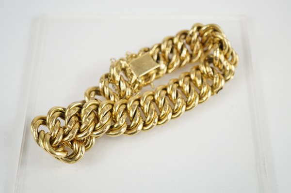 Bracelet en or jaune (750°°°) à mailles articulées. Chaine de sécurité. Poids : 24.7 gr. Longueur : 20 cm.