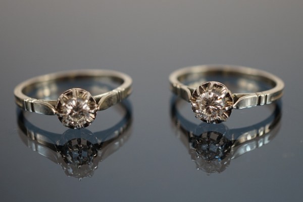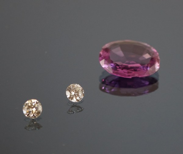 Lot comprenant : Solitaire en or blanc (750°°°) et platine serti d'un brillant d'environ 0,10 carat. Solitaire en or blanc (750°°°) et platine serti d'un brillant d'environ 0,20 carat. Poids des deux solitaires : 4.6 gr. On y joint deux brillants d'environ 0,20 carat ainsi qu'une pierre rose facettée.