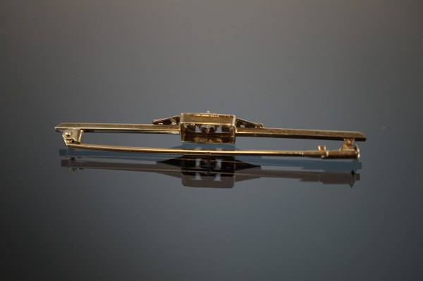 Broche ou épingle à cravate en or blanc (750°°°) et platine centrée d'un petit brillant épaulé d'une ligne de trois petits brillants. Époque Art Déco. Poids brut : 2,2 grs.