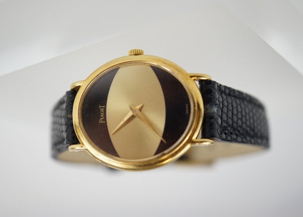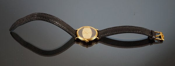 PIAGET. Montre de dame à cadran circulaire en or jaune (750°°°) à fond noir et or, numérotée 9822261824. Bracelet en cuir noir. Boucle fermoir en or jaune siglée P. Poids brut : 22 grs.