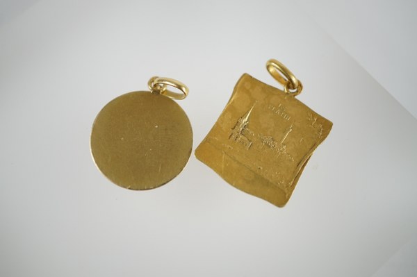 Lot de deux médailles en or jaune (750°°°); l'une à l'éffigie de Notre Dame protectrice des aviateurs et l'autre à l'effigie de St Christophe. Poids : 5,1 grs.