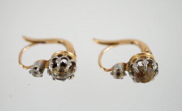 Paire de dormeuses en or de deux tons (750°°°) serties de deux pierres blanches. Poids brut : 3,2 frs.