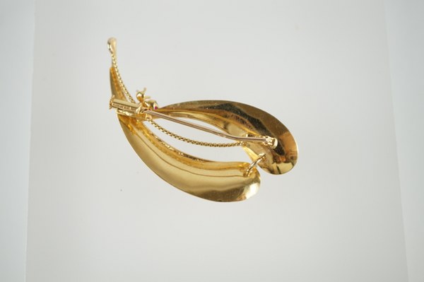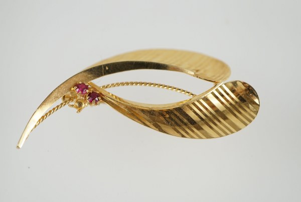 Une broche en or jaune (750°°°) à décor de deux plumes et de deux pierres rouges. Poids brut : 4,3 gr.