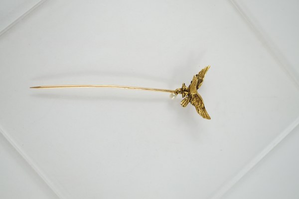 Une épingle à cravate en or jaune (750°°°) surmonté d'un aigle et d'une perle. Poids brut : 2,7 gr.