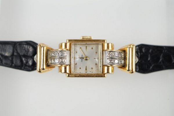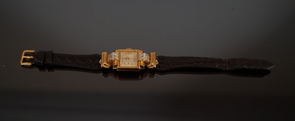 OMEGA. Montre-bracelet de dame en or (750°°°) à boîtier rond, les attaches serties de deux lignes de brillants, bracelet en cuir noir à boucle ardillon en or jaune (750°°°). Travail français des années 40. Poids brut : 27,7 g. brut. Usure.