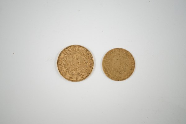 Deux pièces en or comprenant une 20 francs au génie, 1897 et une 10 francs, au coq, 1901. Poids : 9,7 grs.
