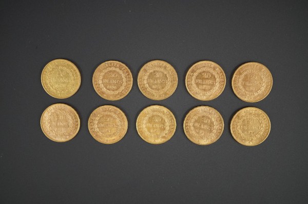 Dix pièces en or de 20 francs au génie entre 1848 et 1898.