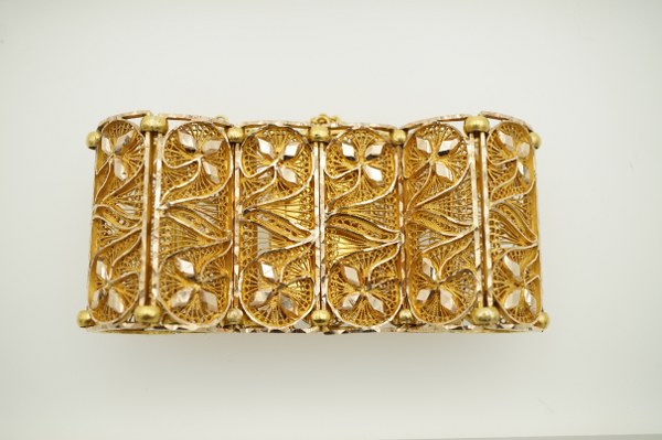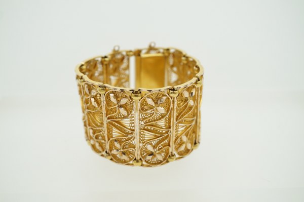 Bracelet manchette en or jaune (750°°°) à décor filigrané. Poids : 99.3gr.