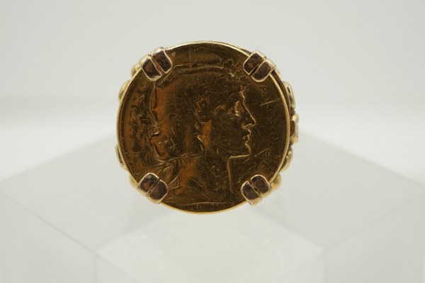 Bague en or jaune (750°°°) sertie d'une pièce de monnaie de 20 francs au coq en or, poinçon à tête d'aigle. Poids net: 10,1 gr.