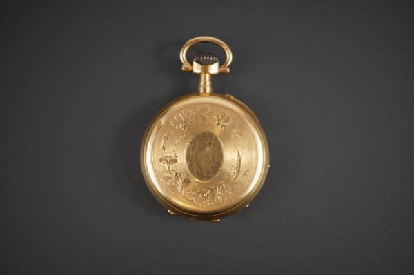 Montre à gousset en or jaune (750°°°), cadran à chiffres romains, frise de fleurs à l'arrière. Poids brut: 47 gr.