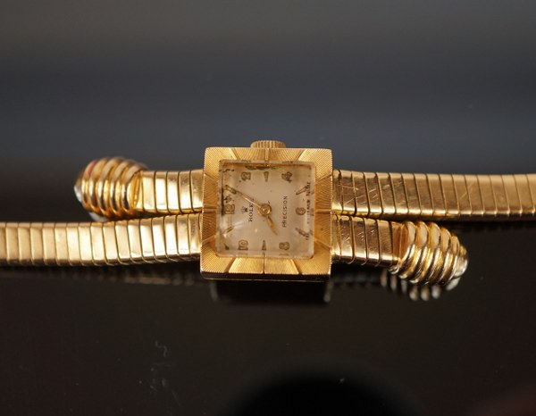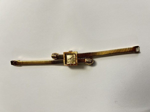 ROLEX PRECISION ANNEES 40 Montre bracelet de dame en or rose 18K (750 millièmes). Boîtier: carré, fond à pression, boîte française. Cadran: argenté, index appliqués, mention « Fab. Suisse », signé. Mouvement: mécanique, signé. Bracelet : intégré, double cordon tubogas extensible en or, boucle simple, poinçon de maître, tête d'aigle, non signé Rolex. Cadran et mouvement signés. Numérotée 908. (Fonctionnement non garanti). Dim. 21 x 21 mm. Longueur: 16,5 cm. Poids brut: 36,7 g. Pour ce lot la SC E & S Portier est assistée de Géraldine Richard, expert SFEP.
