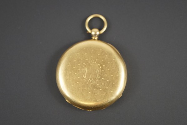 Une montre gousset en or jaune 750°°°. Cadran émaillé indiquant les heures en chiffres romains. Poids brut : 54,6 grs. Manque le verre, cadran fêlé.