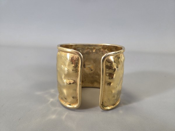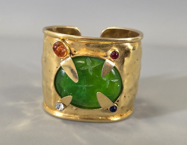 DAUM France et Mc Connico. Bracelet exotique manchette en métal doré martelé, orné d'un cabochon de pâte de verre. Accident.