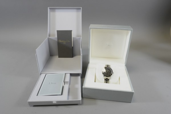 DIOR. Montre "Christal en acier, référence CD11311FM001. Lunette crantée tournante, cadran rond à fond noir, index bâtons, trotteuse centrale. Le dos signé et numéroté. Bracelet en matière synthétique agrémenté de cristaux facettés, à boucle déployante acier signée. Bracelet en acier avec boucle déployante. Carte de Garantie, livrets, écrin et boîte.