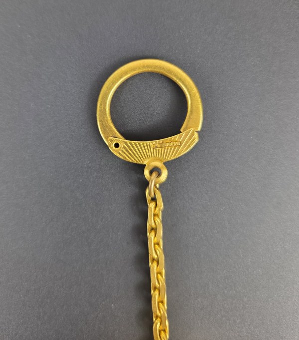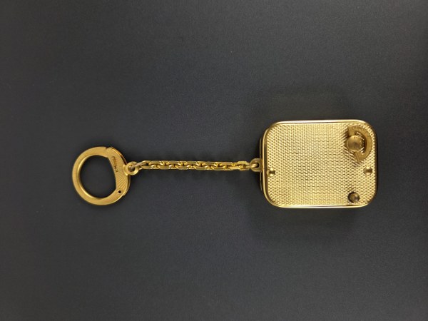 HERMES. Porte-clés boîte à musique par Reuge Ste Croix en métal doré guilloché. 4 x 3 cm. Usure.
