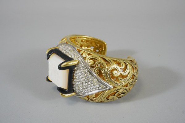 ROBERTO CAVALLI. Bracelet manchette ouvert en métal doré grave repéré ajouré rehaussé d'un oeil pavé de strass et rehaussé d'un cabochon de nacre. Signé.
