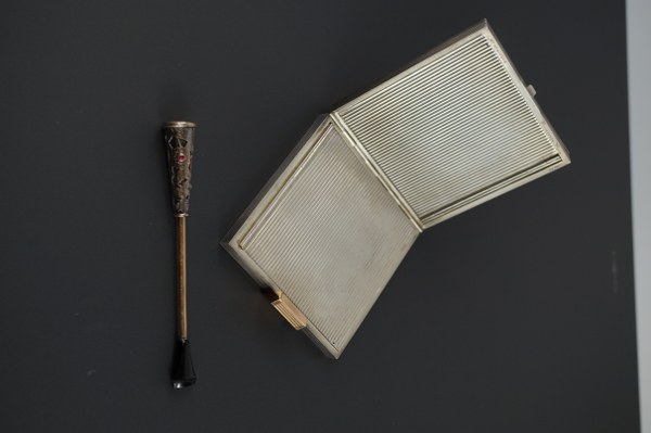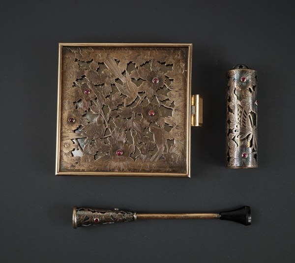 BOUCHERON. Parure de trois pièces comprenant : - un poudrier en or et argent, le couvercle à charnière à décor ajouré , ciselé et gravé d'oiseaux dans un entourage végétalisé de branches feuillagés et fleurs ponctués de petits rubis s'ouvre sur fond de miroir. Signé Boucheron Paris et numéroté 875012. Poids brut : 231 grs. - Etui à rouge à lèvres en argent ajouré,ciselé à décor de papillons dans un cadre bucolique et végétalisé, les fleurs à décor de petits rubis. Signé et numéroté 875012. Poids brut : 49 grs. - Porte-cigarette en or et argent à décor ajouré, ciselé et gravé de papillons et oiseaux dans une végétation luxuriante incrusté de petits rubis. Signé et numéroté 83061. Poids brut : 11 grs. Epoque 1940.