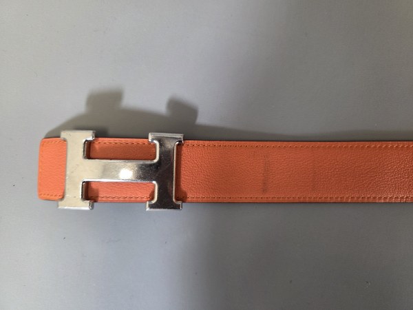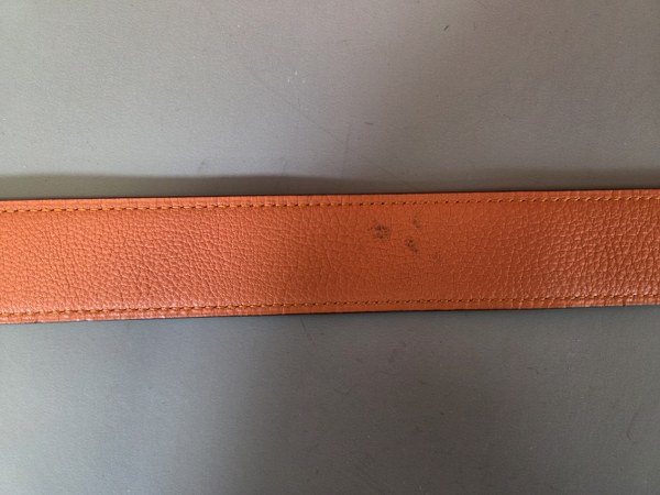 HERMES. Ceinture réversible en cuir orange d'un côté et noir de l'autre. Boucle en métal. Longueur : 105 cm. Salissure, griffes.