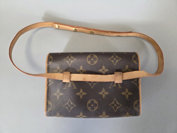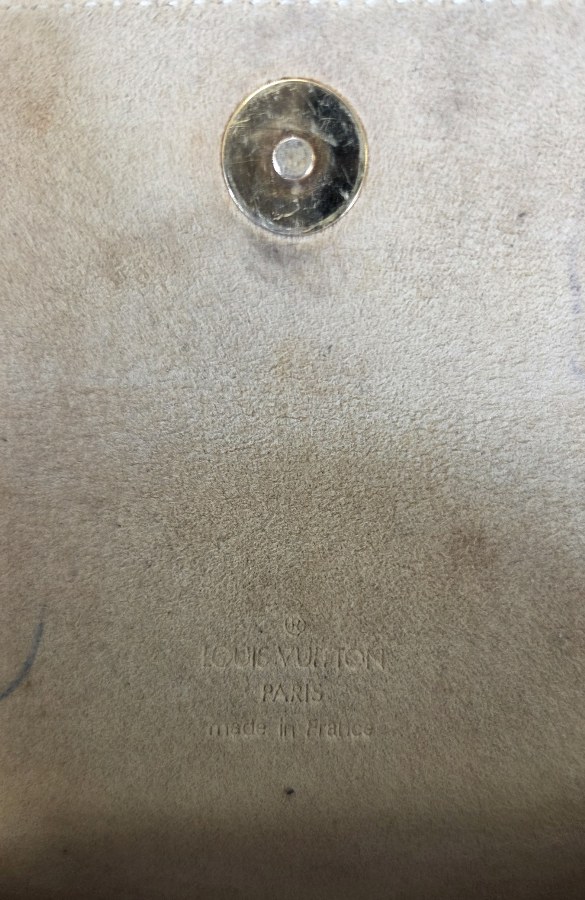 VUITTON. Pochette avec bandoulière réglable par bouton pression. 11 x 16 x 3 cm. Accident, usure, traces de stylo, salissure. Bouton non fonctionnant.