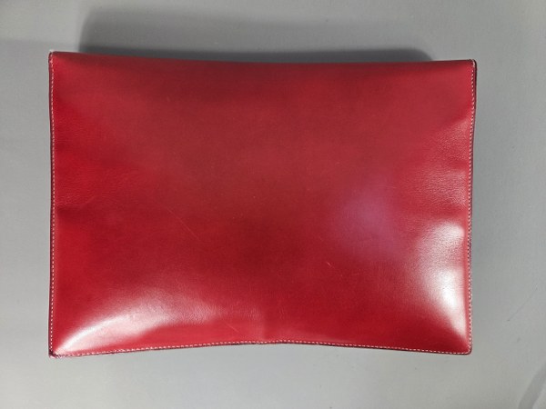 CHRISTIAN DIOR. Pochette en cuir rouge surpiqué blanc, fermoir enveloppe chiffré doré. Traces d'usure. 30 x 21 x 4 cm.