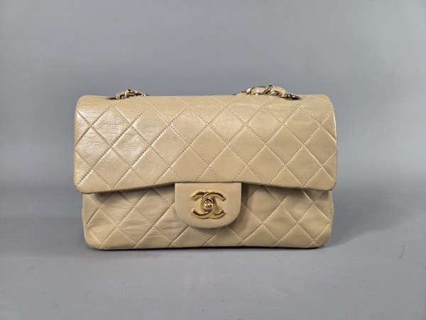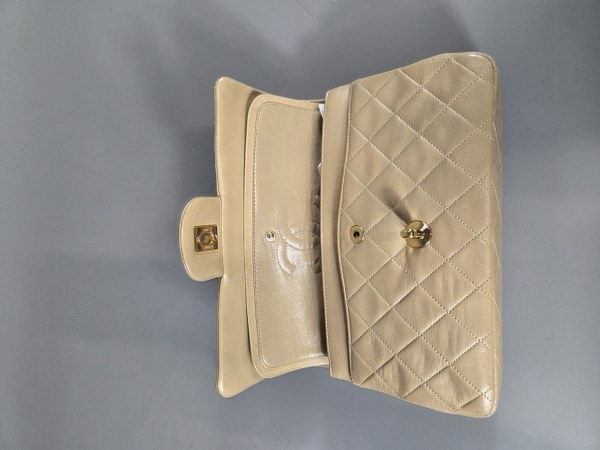 CHANEL. Sac Timeless en cuir matelassé beige, fermoir pivotant sigle en métal doré sur rabat, poche plaquée au dos, anse bandoulière chaine entrelacée de cuir. Tampon or Chanel made in France. Usure. Petites tâches. 14 x 23,5 x 7,5 cm.