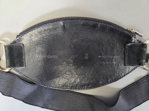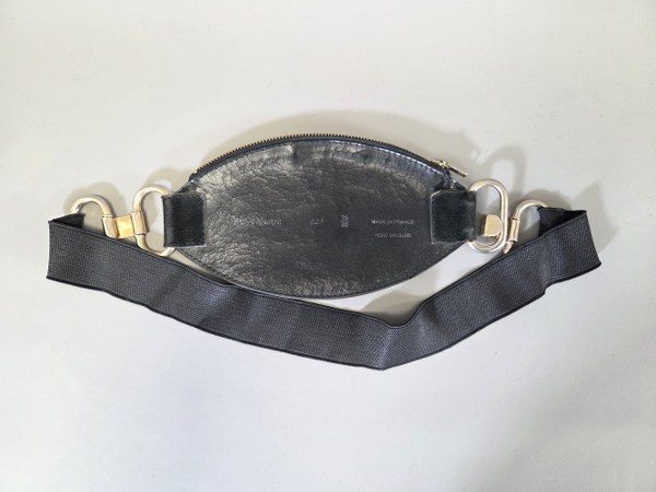 YVES SAINT LAURENT. Ceinture banane zippée en daim noir clouté doré siglé sur sangle élastique. Taille 75. Elastique usé. Traces d'usure. Longueur banane: 25 cm.