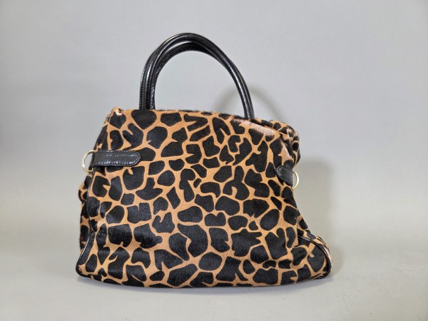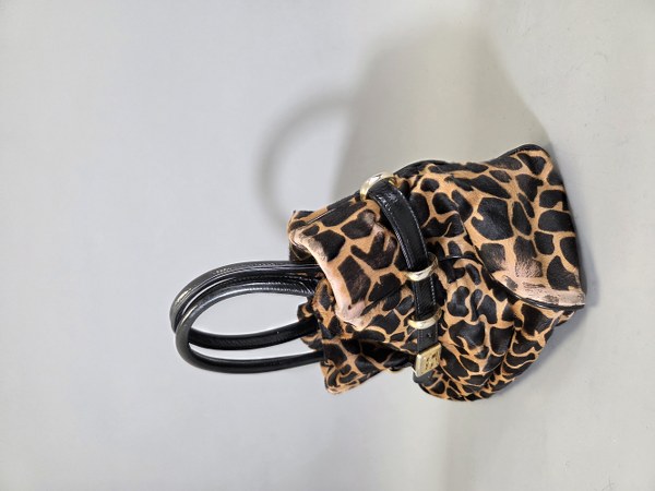 SONIA RYKIEL. Sac porté main imprimé panthère effet froncé sous patte, double poignée cuir, fermoir aimanté. 27 x 32 x 15,5 cm. Usure importante.