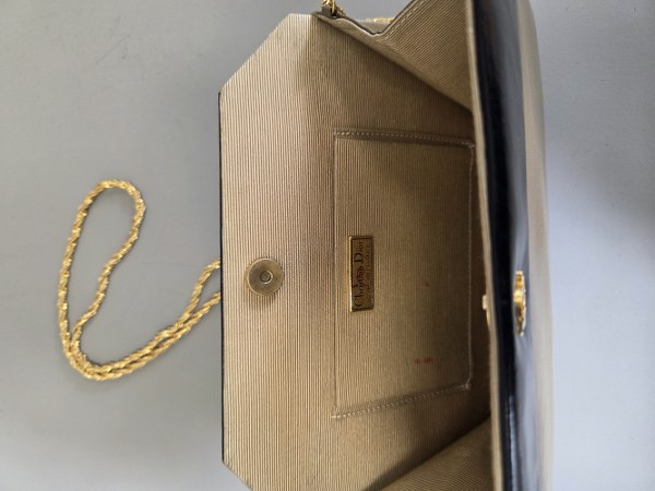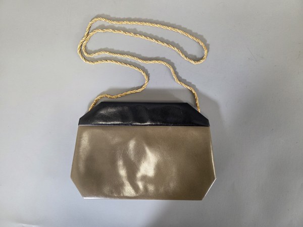 CHRISTIAN DIOR. Petit sac cérémonie cuir bicolore noir, taupe, anse chaine tressée dorée, fermoir aimanté sur doublure gros grain beige. 16 x 22,5 x 3 cm. Traces d'usure, petites tâches à l'intérieur.