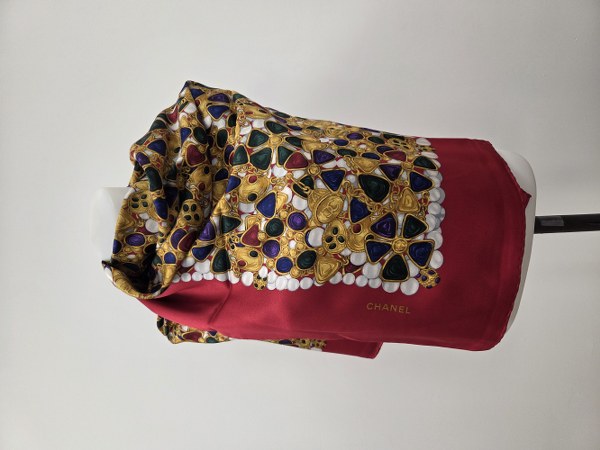 CHANEL. Etole en satin à décor de bijoux. 135 x 135 cm. Traces d'usage et tâches.